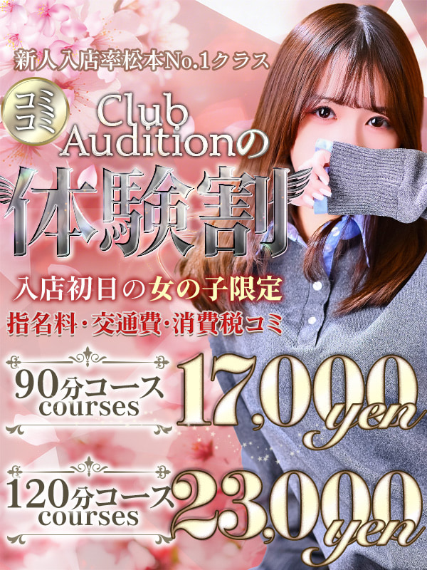 3/13 22:48 ❤入店初日の子限定♡全てコミコミ♡体験割❤ Club Audition♡ 体 験 割 ♡ ☆【大好評!当店人気コース!】☆入店初日女の子限定プラン❤指名料、交通費、消費税全て込みの大特価90分コース総額17,000円!!120分コース総額23,000円!!※塩尻北IC周辺のラブホテル以外は別途交通費を頂戴致します。※口コミ特典との併用不可 ◆ EVENT INFORMATION ◆ ◇ 本日出勤女の子 ◇◆ エチ♡エチ写真 ◆- Club Audition -TEL:080-2640-6258